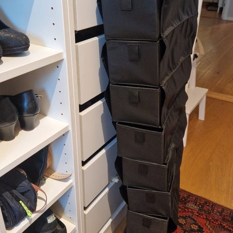 Hylle. Det har vært skuffer i den tidligere, men har vært brukt som bokhylle.