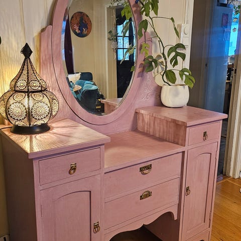 Antikk sminkebord til salgs. Arvet etter min bestemor. Perfekt sminkebord til en ung jente. 4 skuffer gjemt bak et forheng. Forhenget kan lett byttes ut, til et mer moderne stoff.