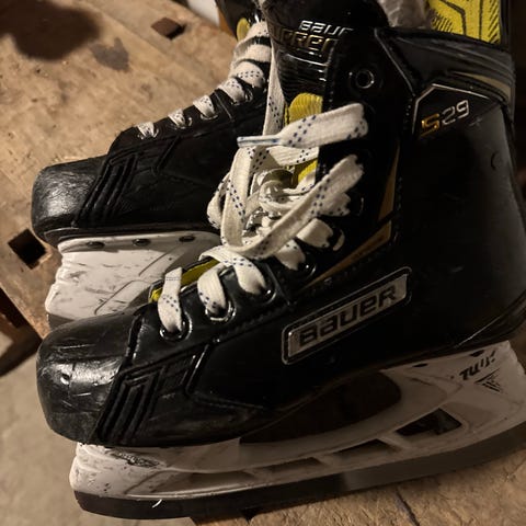 Bauer Supreme S29 hockeyskøyter i str. 3EE/ 36. Skøytene er godt brukt og har 1 cm med stål igjen midt under skøyta. Skal de kun brukes på løkka/til hobbybruk så holder de fint en sesong eller flere, avhengig av hvor ofte man vil trenge å slipe.