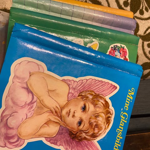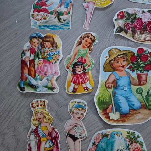 Samling av 15 eldre glansbilder med motiv av Snøhvit og de syv dvergene.