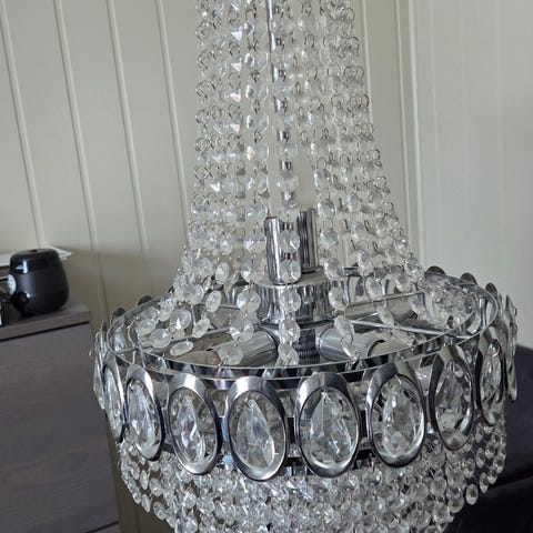 Ser ut som det er en messing lysekrone, 5 armet, 5x40w pærer, E14 sokkel.