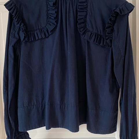 By Malene Birger. Lekker bluse i størrelse S, laget av silke med grå farge. Blusen har en løs passform og lang erm, egnet for kvinner.