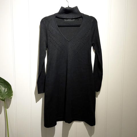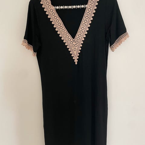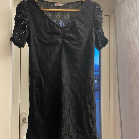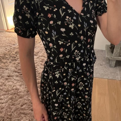 H&M hverdagskjole i svart farge, størrelse S. Kjolen har en enkel og klassisk design med elastisk midje og trekvartlange ermer. Materialet er lett og delvis gjennomsiktig på ermene, egnet for hverdagsbruk.