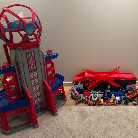 Sønnen vår selger en stor pakke med Paw Patrol leker som inkluderer flere kjøretøy, figurer og utkikkstårnet.
