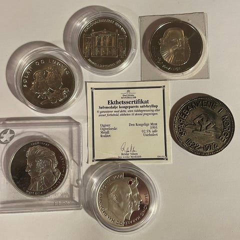 Sett med to medaljer i treskrin, hver medalje har profilbilder og tekst i relieff. Medaljene er plassert i et polert treskrin med beskrivende tekst på innsiden av lokket. Passer som samlerobjekt eller dekorasjon.