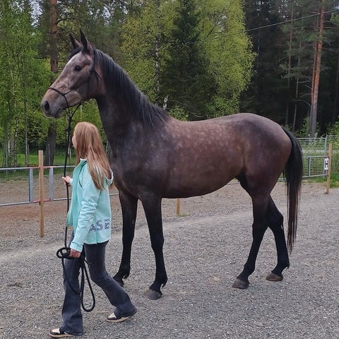 «Kelly» er etter Kannan - Out of Touch (1.50m hoppning). Måler 165cm. Hun er veldig snill og ukomplisert i både ridning og håndtering. Hun er fin i munnen og har egen fremdrift med tydelig brems. Har hoppet litt feltritt inspirerte ting med henne, og startet 90/1m på stevne. Hun er fortsatt litt grønn og urutinert men er veldig lærevillig og enkel å ri. Titter ikke på hinder og er modig. En hest som vil kunne passe mange forskjellige ryttere.