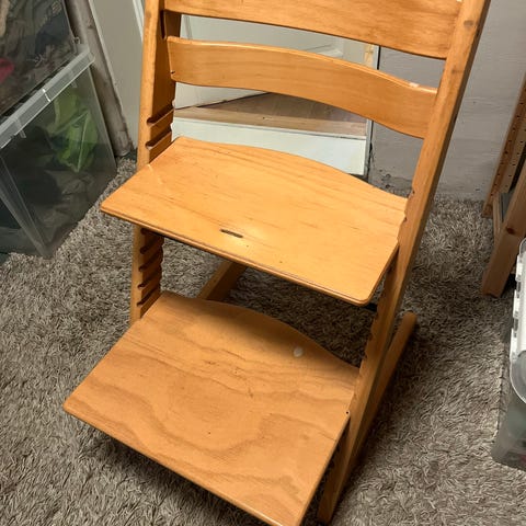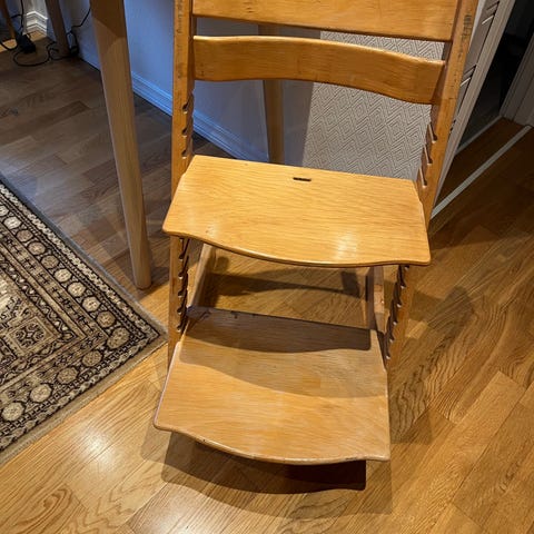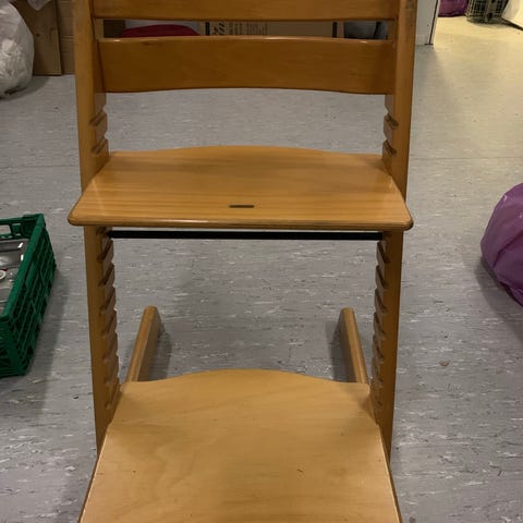 Stokke høy barnestol laget i tre. Stolen har justerbar sitte- og fotplate for tilpasning til barnets vekst. Designet for barn, med fokus på funksjonalitet og holdbarhet.