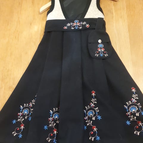 Bunad/festdrakt med nydelige detaljer fra seint 80/tidlig 90-tallet. God kvalitet og mye bruk igjen. Eneste er at bryst stykket må festes med sikkerhetsnål da det ikke er feste lengre.