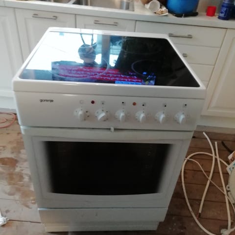 Bosch keramisk komfyr med keramisk topp. Komfyren har flere kontrollknapper for innstillinger og er hvit i fargen.