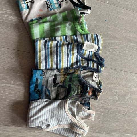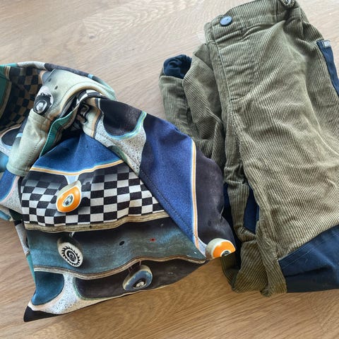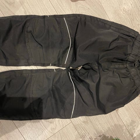 En grønn Didriksons overtrekksbukse str. 120 og en svart Helly Hansen overtrekksbukse str. 122.