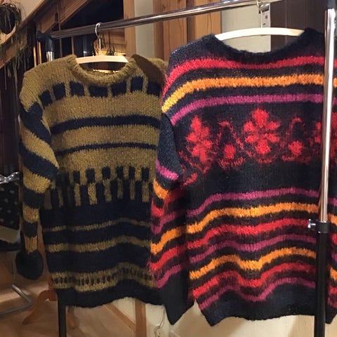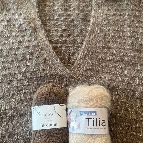 Strikket i 2 tråder, 80% mohair, 20% silke. Strikket etter mønster fra ingen dikkedare/ petiteknit, men strikket nedenfra og opp. Mål, br fra underarm til underarm ca 50 vm, lengde 54 cm, arm 44cm. Fargen er vinrød, litt mørkere/dypere enn bildene tilsier.