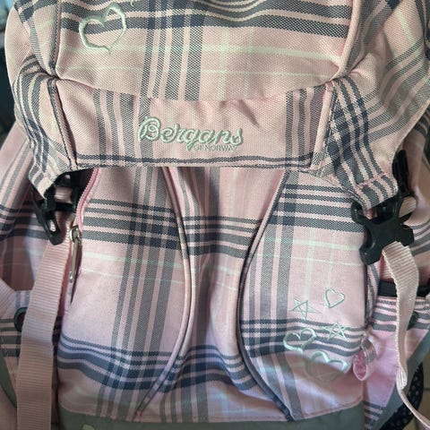Bergans rød stoff ryggsekk for unisex. Ryggsekken har flere lommer inkludert nettinglommer på sidene og en toppåpning med snøring. Den har justerbare skulderstropper og polstret rygg for komfort. Passer til daglig bruk og utendørsaktiviteter.
