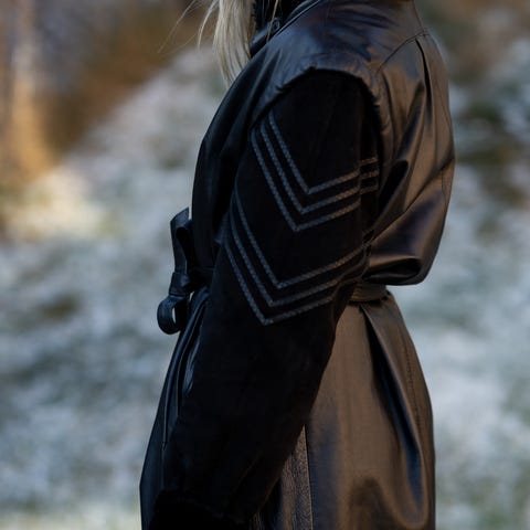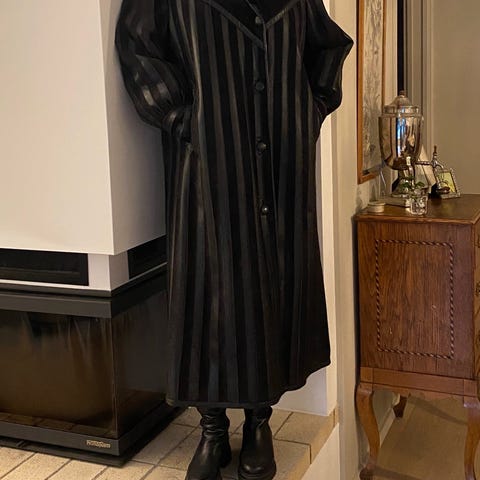 Nydelig vintage skinnkåpe fra Friitala, Finland. Hanskemykt skinn, ingen synlig slitasje. Størrelse 42, men stor i størrelsen. Store skuldre med puter og liten klaff med knapp. Store utenpålommer.