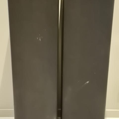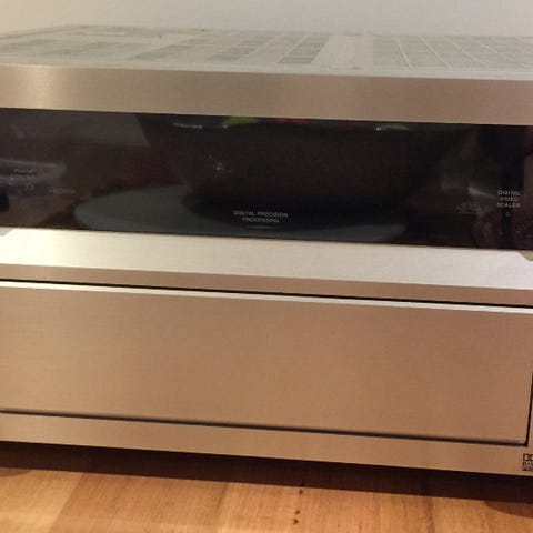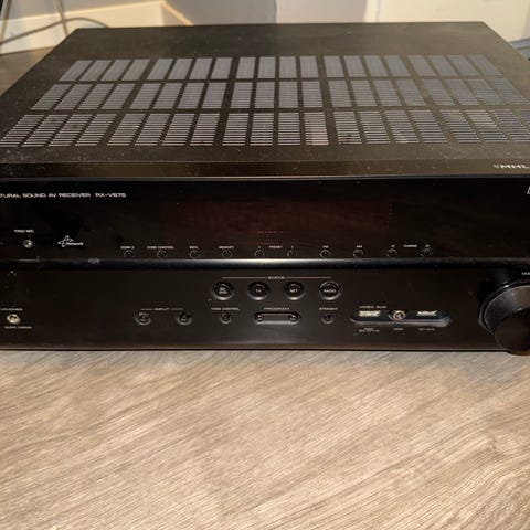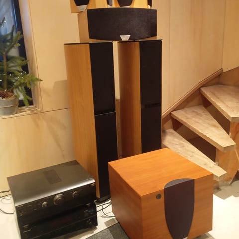 Onkyo AV-mottaker med flere tilkoblingsmuligheter for lyd- og bildekomponenter. JVC høyttalersystem bestående av to gulvhøyttalere, en senterhøyttaler og en subwoofer. Systemet er svart og egnet for hjemmeunderholdning med surroundlyd.