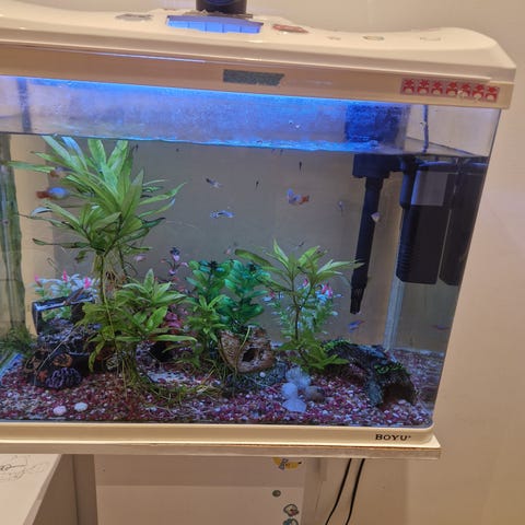 8 guppyer. Akvarium med integrert belysning, dekorative planter og underlag. 60 liter.