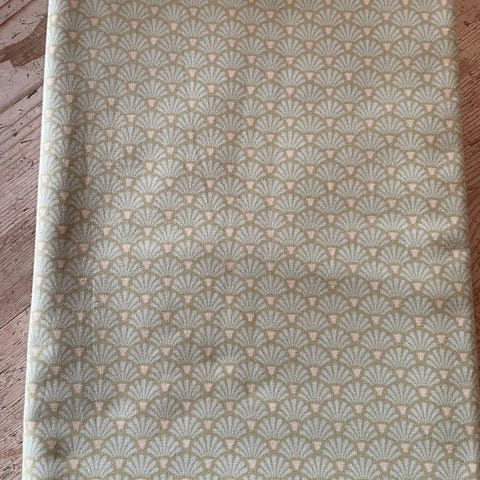 Dette er et mønstret stoff med en kombinasjon av farger som inkluderer beige, rødt og grønt. Stoffet har et dekorativt design som kan brukes til ulike tekstilprosjekter.