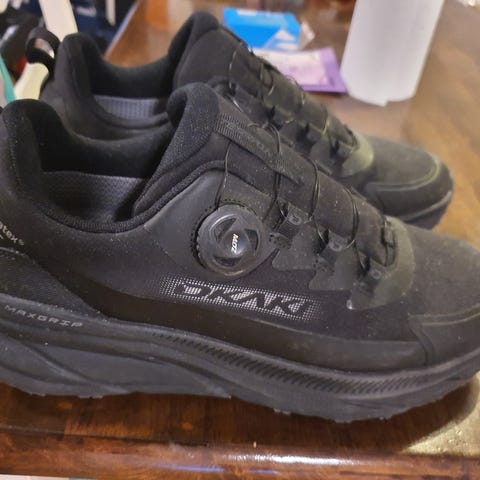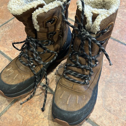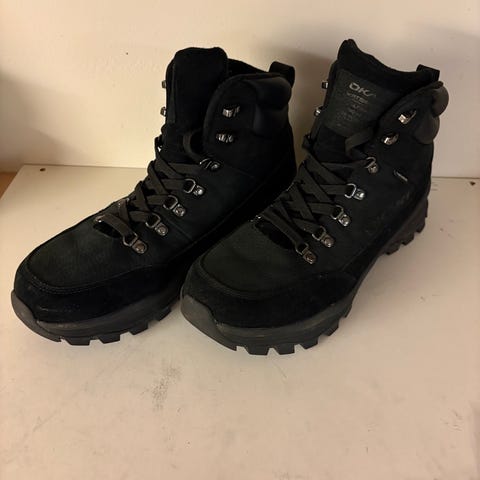 Okaki forede og varme vintersko til herre str 44. Kun brukt perioden nyttår-våren 2025 av tenåring med stadig større føtter. Med glidelås på skaftet. Farge: svart.