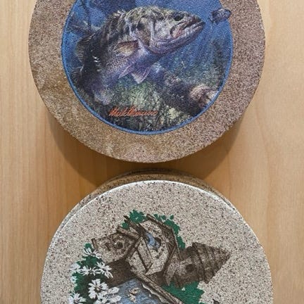 Blått med fugl på. 4 asjetter som er helglasserte og 4 krus av keramikk. Helt og pent