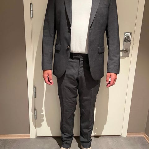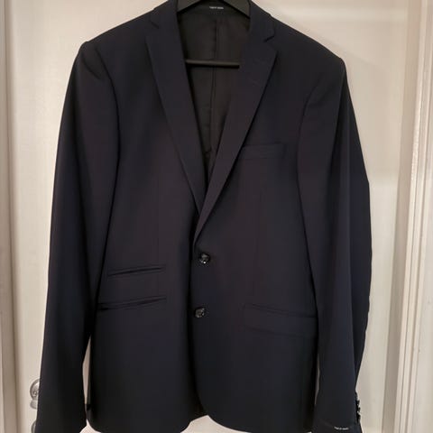 Seler en Tiger of Sweden dress i blå med striper, laget av ull. Jakken er i størrelse 50 og buksen er i størrelse 48. Dressen er pent brukt og vært på rens med jevne mellomrom.