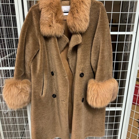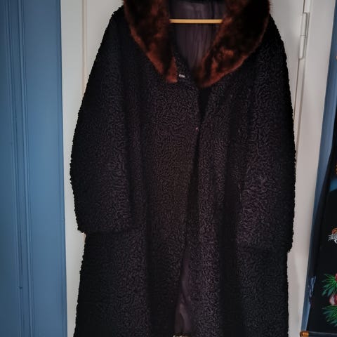 Nydelig lang kåpe i 100% ull og avtagbar hette m/skjerf. Farget brun minkpels på hetten. Skulderputer. Motfold for ekstra vidde i ryggen. Lengde ca. 127 cm. Bryst 136 cm. Ser ubrukt ut.