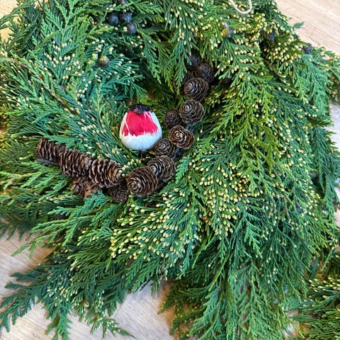 Kunstig sederkrans fra kremmerhuset selges. Lappen henger forsatt på.