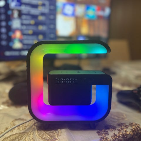 Dette er en alt-i-ett smart enhet som kombinerer RGB stemningslys, Bluetooth-høyttaler, sound machine, digital klokke, alarm OG trådløs mobil lading – i et moderne og eksklusivt design.