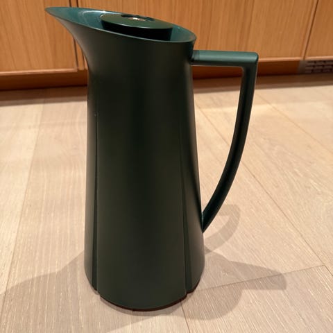 Kannen er godt brukt i mange år, og har noen overfladiske bruksmerker. Blant annet noen små hakk rundt hellekanten. Den har likevel masse god bruk igjen, og holder veldig godt på varmen (flere timer). Selges kun fordi vi har fått ny kanne i gave.