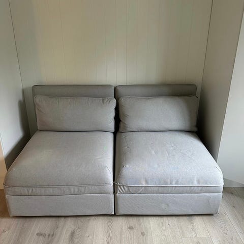 IKEA Friheten sovesofa i grått stoff med chaiselong og oppbevaringsfunksjon. Sofaen kan enkelt gjøres om til seng, og har et praktisk oppbevaringsrom under chaiselongen. Passer for daglig bruk i stue eller gjesterom.