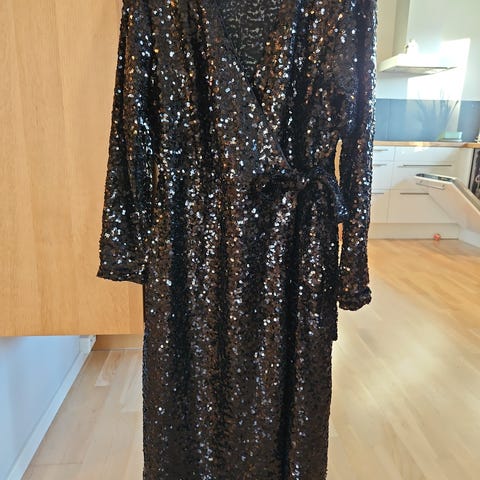 H&M festkjole i størrelse L med svart farge og paljetter. Kjolen har lange ermer og omslagsdetaljer i front. Materialet består av paljetter som gir et glitrende uttrykk.