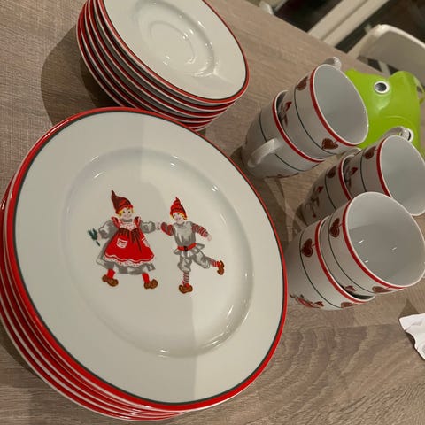9 krus og 8 frokosttallerkener selges samlet for kr. 1000,-