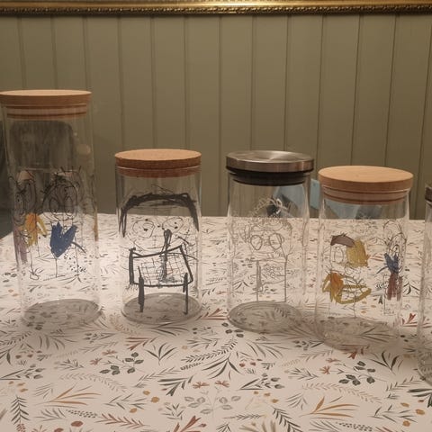 Drikkeflasken og glassene er ikke slitte eller på annen måte skadet. Kan kjøpes samlet eller separat. Vannflasken er laget av glass.
