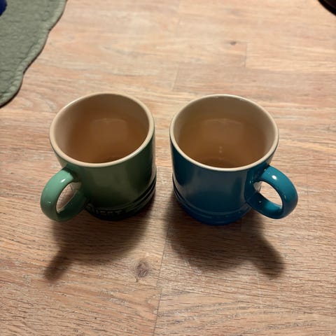 Le Creuset kaffekopper i flere farger, laget av keramisk materiale. Settet inkluderer kopper i gul, blågrønn, rød og oransje farge. Passer for daglig bruk til servering av kaffe eller andre varme drikker.