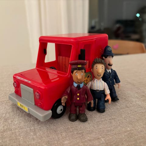 Selger Postman Pat og Brannmann Sam. Det mangler en bakdør på postbilen "pat1". På flyet "pat3" snurret propellen og det lyser i front. På brannbilen skal alt være i orden.
