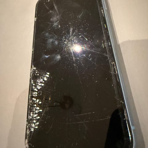 En IPhone 10 med store skader foran og bak. På skjermen foran er det en strek som tar opp en del av skjermen. Mobilen funker godt og kan bli brukt hvis man overser den store hvite streken på skjermen. Kan bli brukt for deler. Kommer også med et deksel. Den er cirka 3 år gammel.