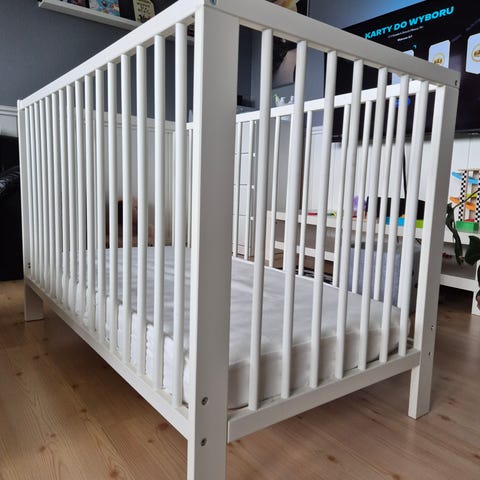 IKEA Myllra sprinkelseng babyseng med hvite og naturfargede detaljer. Sengen har en stor oppbevaringsskuff under soveområdet, og er laget i materialer tilpasset barn. Passer for små barn og gir praktisk oppbevaringsplass.