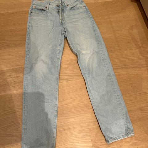 Levi's jeans i blått, størrelse S for dame. Laget av bomull med midje størrelse W28. Klassisk design med fem lommer og knappelukking.