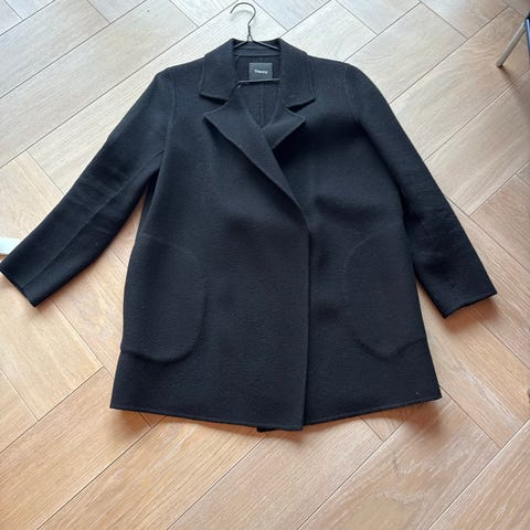 Theory Kåpe i størrelse S, laget av ullmateriale (10 % Cashmere/90 % ull) i beige farge. Et nydelig rutete mønster i jakken i beige toner.