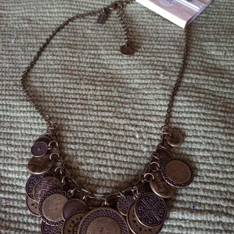 Pent og chunky halskjede fra Oasis i en lys gullfarge (litt på midten av gull og sølvfarget). Lite brukt, og ikke mye påvirket av tiden (hatt i hvertfall 15 år)