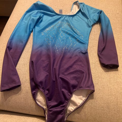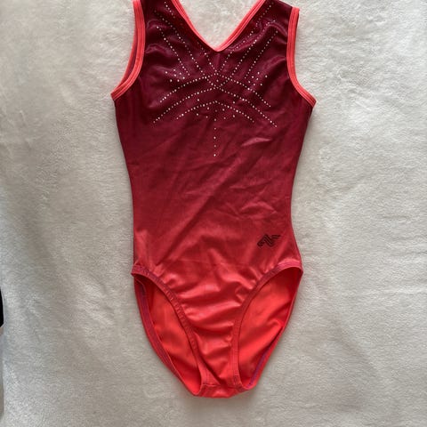 Gymnastikkdrakt / turndrakt for barn i størrelse 12 år (146) med lange ermer. Liten i stlrrelse. Drakten har en rosa front med sølvfargede ermer og et dekorativt mønster i gull. Egnet for ulike typer sport og aktiviteter. Full lengde ca. 60-61cm.