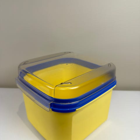 Dette er en Tupperware trekantet oppbevaringsboks, også kalt en "trekantboks" eller "Midi Modulett".