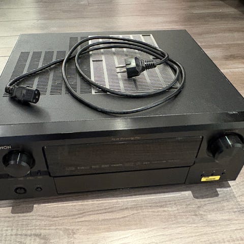 Denon AV-mottaker med flere tilkoblingsmuligheter for lyd og bilde, inkludert HDMI, USB og analoge innganger. Enheten har kontrollknapper på frontpanelet og er designet for hjemmeunderholdningssystemer.