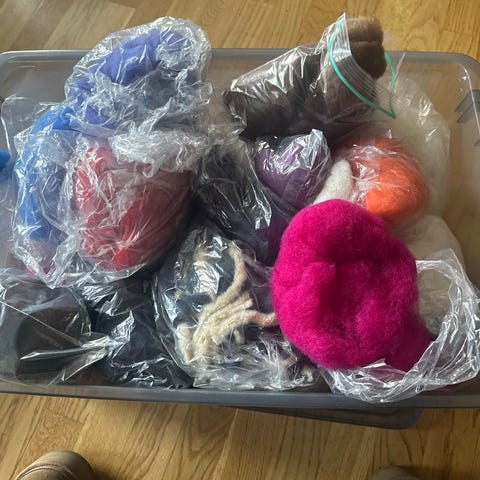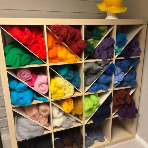 Ull til toving i forskjellige farger: grå, rød, rosa, blå, oransje, hvit, gul, svart, lilla, grønn