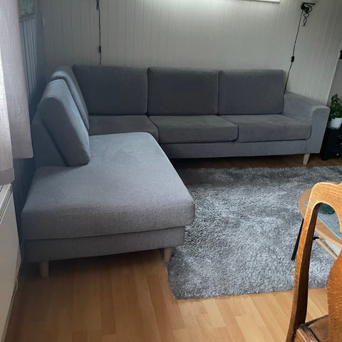 Edda hjørnesofa m/sjeselong. Se mål på siste bilde. Kjøpt i august 2022 på Skeidar. Koster 28999kr ny i dag. Ikke dyr eller røyk. Pent brukt.