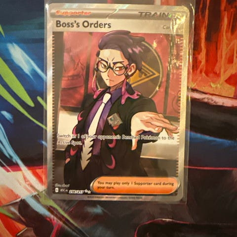 Pokémon Trainer Boss's Orders Supporter kort med holografisk design. Kortet brukes i Pokémon-kortspill og fungerer som en supporter med spesifikke spilleregler. Kortet er nummer 179/192.