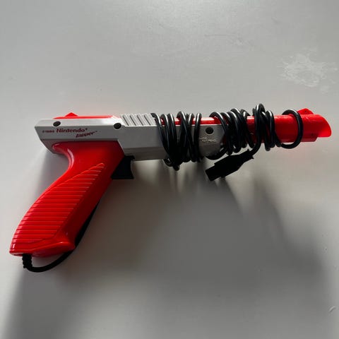 Nintendo NES Zapper lyspistol i oransje og grå farge. Tilkobles konsoll via kabel. Brukes til skytespill på Nintendo-systemer.