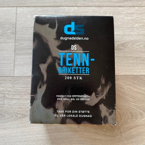 Dugnadsdeal Tennbriketter, pakke med 250 briketter. Jeg har 8 uåpnet esker. Per eske koster 200. Opprinnelig pris var 450 kr. Brikettene er produsert i Norge og inneholder kun rene råvarer.