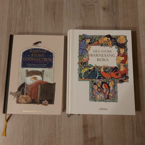 «Den store godnatt boka» er 340 sider med eventyr og fortellinger. «Barnas store rim- og reglebok» er 266 sider med rim og regler. Bøkene er i veldig god stand:) Selges samlet.