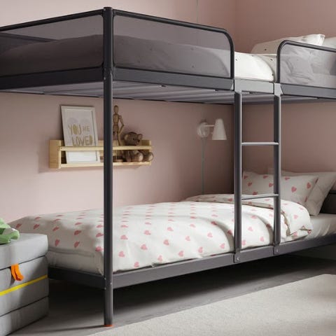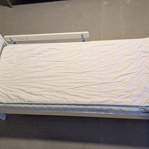 IKEA enkeltseng barneseng i hvit farge. Sengen har integrerte oppbevaringsskuffer under sengen, som gir ekstra lagringsplass. Passer for barn og er laget i materialer egnet for barnerom, men kan også brukes av tenåringer og voksne uten problemer!