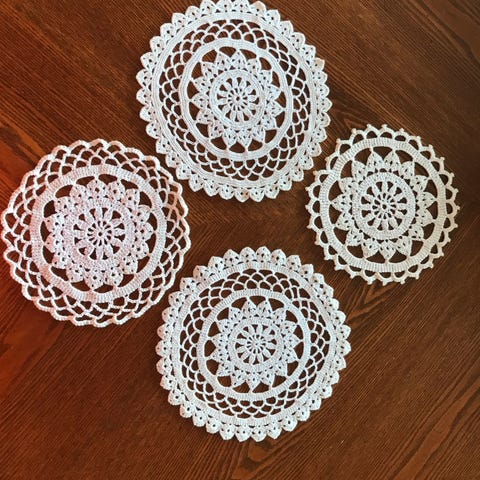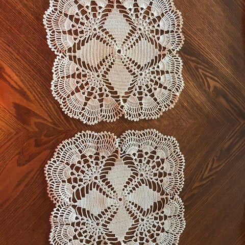 Div. Hekkladuket i forskjellige rosafarget og forskjellige tykkelse på tråd. Kan kjøpes enkeltvis. Alle for 150 Første74cm lang-18cm brei. Rund 30cm dia. Oval 35cmx24. Stor rund: 49cm diameter.