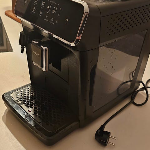 Siemens espressomaskin i svart farge. Maskinen har integrert melkeskummer og dryppbrett. Egnet for tilberedning av espresso og andre kaffedrikker.
